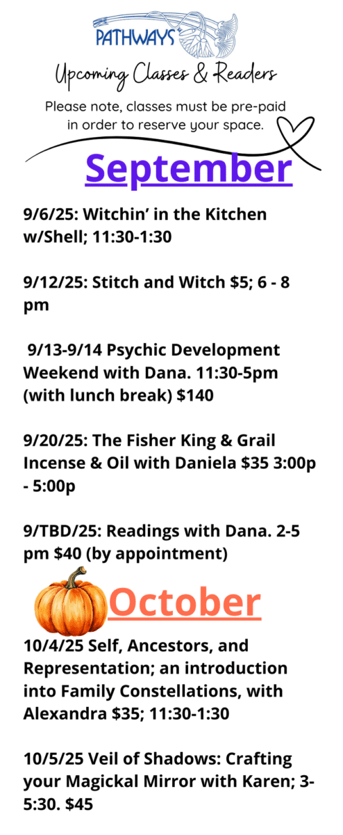 Find out what classes are being offered at Pathways in spooky season! Call the shop to sign up for September and October classes!